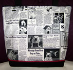 Wirehaired Dachshund HandbagEach of these bags are handmade with the highest of quality and detail to the breed. The dachshund is appliqued on a cotton "The Canine Chronicles" newsprint themed fabric . It has a red and gray beaded collar. The bottom of the bag and the dachshund are in a black ultrasuede fabric. There is a small red cording between the black and newspaper fabric.