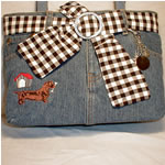 Denim Doxie Purse How cute is this! The purse that looks like your favorite pair of jeans , complete with 5 pockets and a zipper! Blue denim material accented with a black & white checkered sash through the 'belt loops' , fastened & tied in a bow with a silver loop. The front has a monogram of a doxie with a bone . The dachshund's house sits in the background! A 'dog tag' and tiny charms are clipped on a belt loop for a special touch! The straps are decorated with rhinestones on the outside and the inside of strap matches the lining. 11.5" Long 9.00" Deep 4.25" Wide Item number -1010036 $29.95 Out Of Stock |